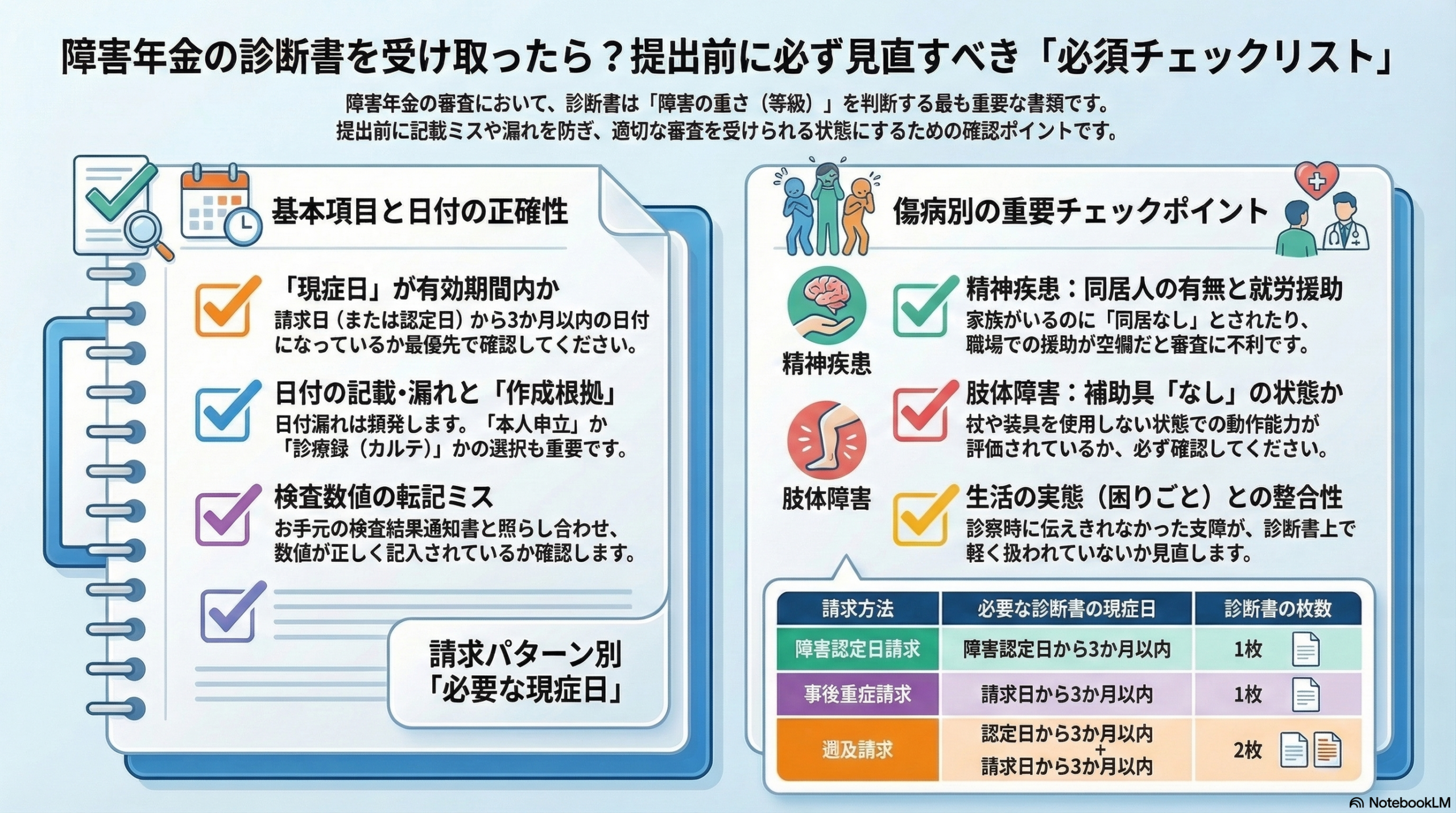 肢体の診断書は「補助用具を使用しない状態」で評価する決まりですが、誤って補助具あり(できることが増えた状態)で書かれてしまうと、等級が軽く判定される原因になります。 - 【精神障害の場合】同居者や就労状況の記載があるか: